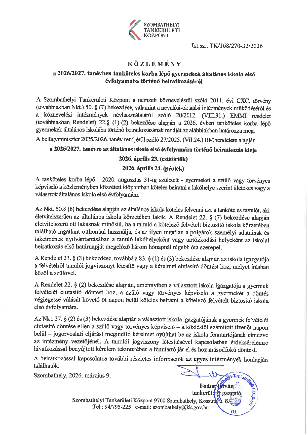 Közlemény a tanköteles korba lépő gyermekek első évfolyamba történő beíratásáról