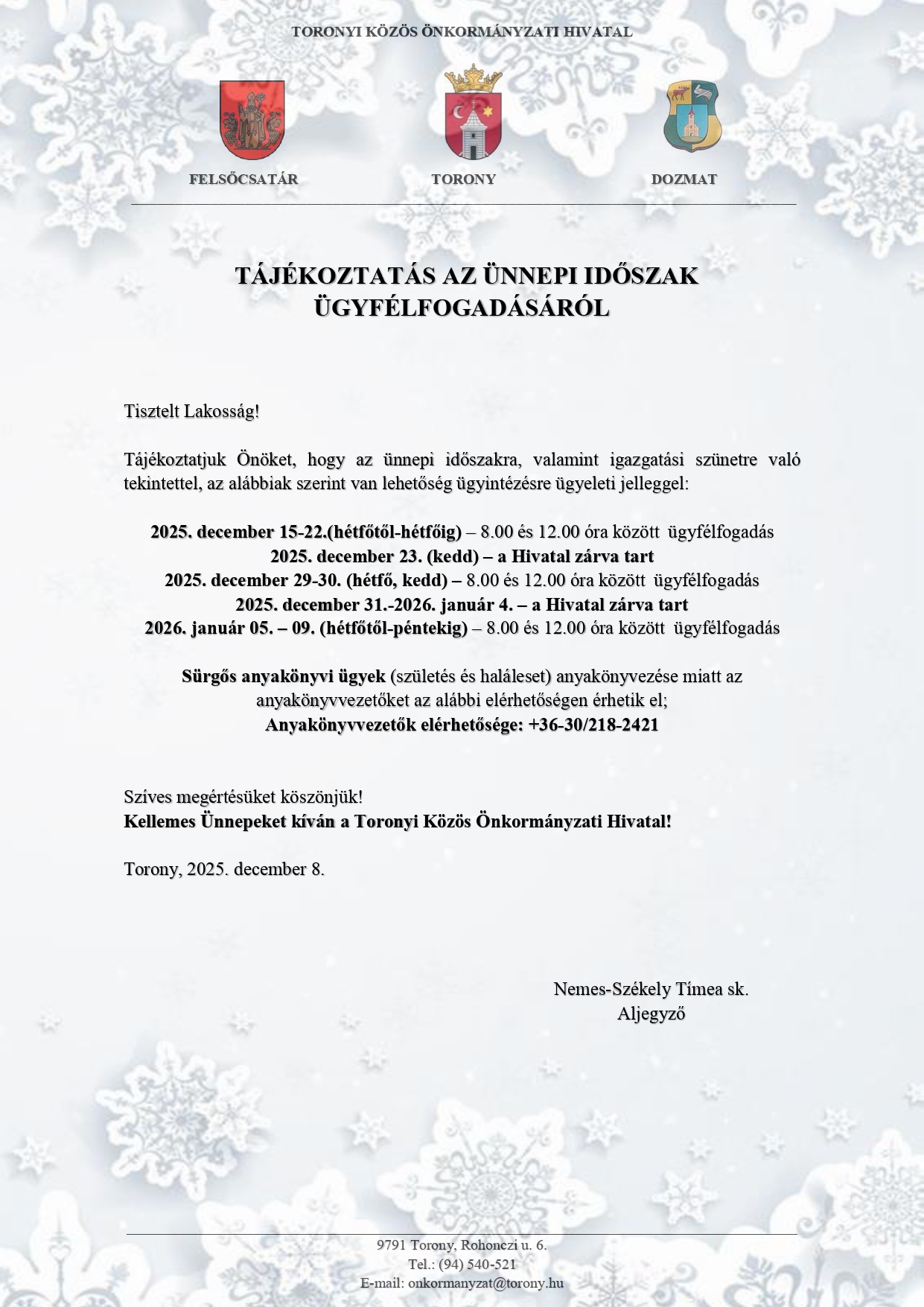Toronyi közös Önkormányzati hivatal ünnepi nyitvatartása