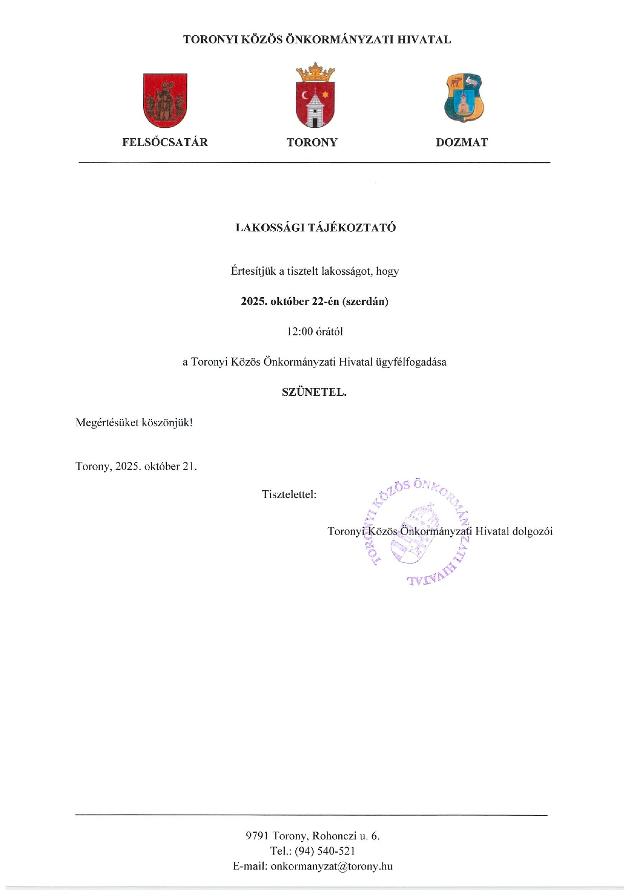 Toronyi közös Önkormányzati hivatali tájékoztató
